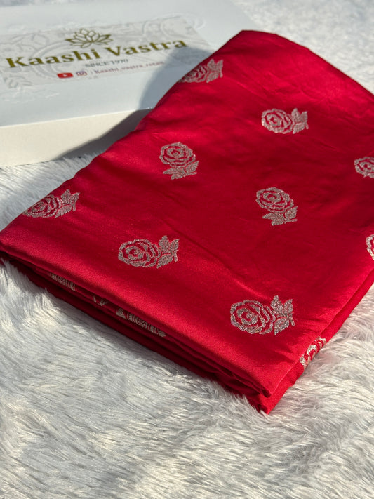 chilli red rose boota Mashru Silk Saree with light silver ZARI MK156