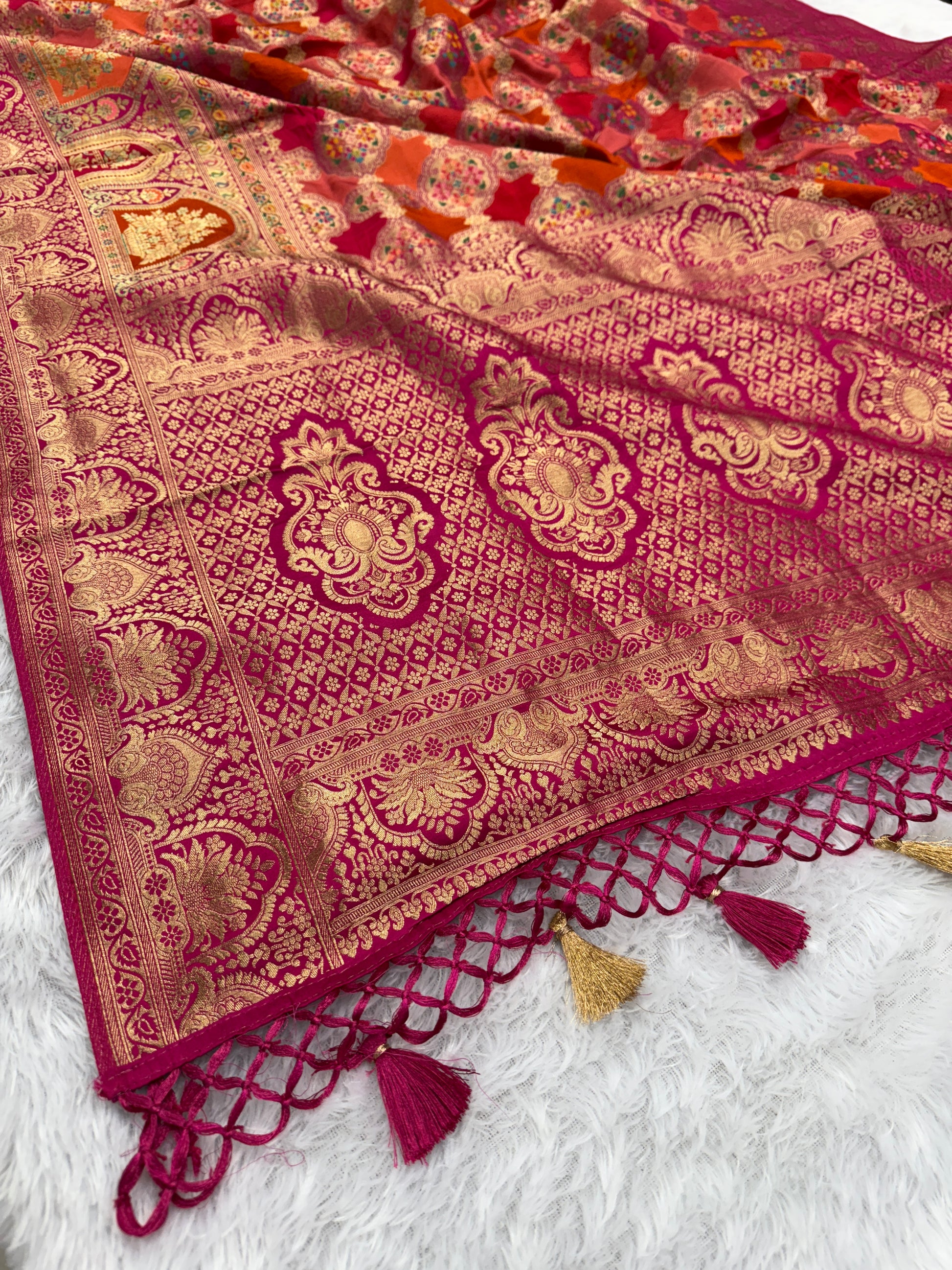 Crafted from the finest quality pashmina silk, this Banarasi saree boasts a luxurious satin texture. With intricate traditional designs and elegant drape, this saree exudes opulence and grace. Perfect for special occasions or elevating your everyday look.