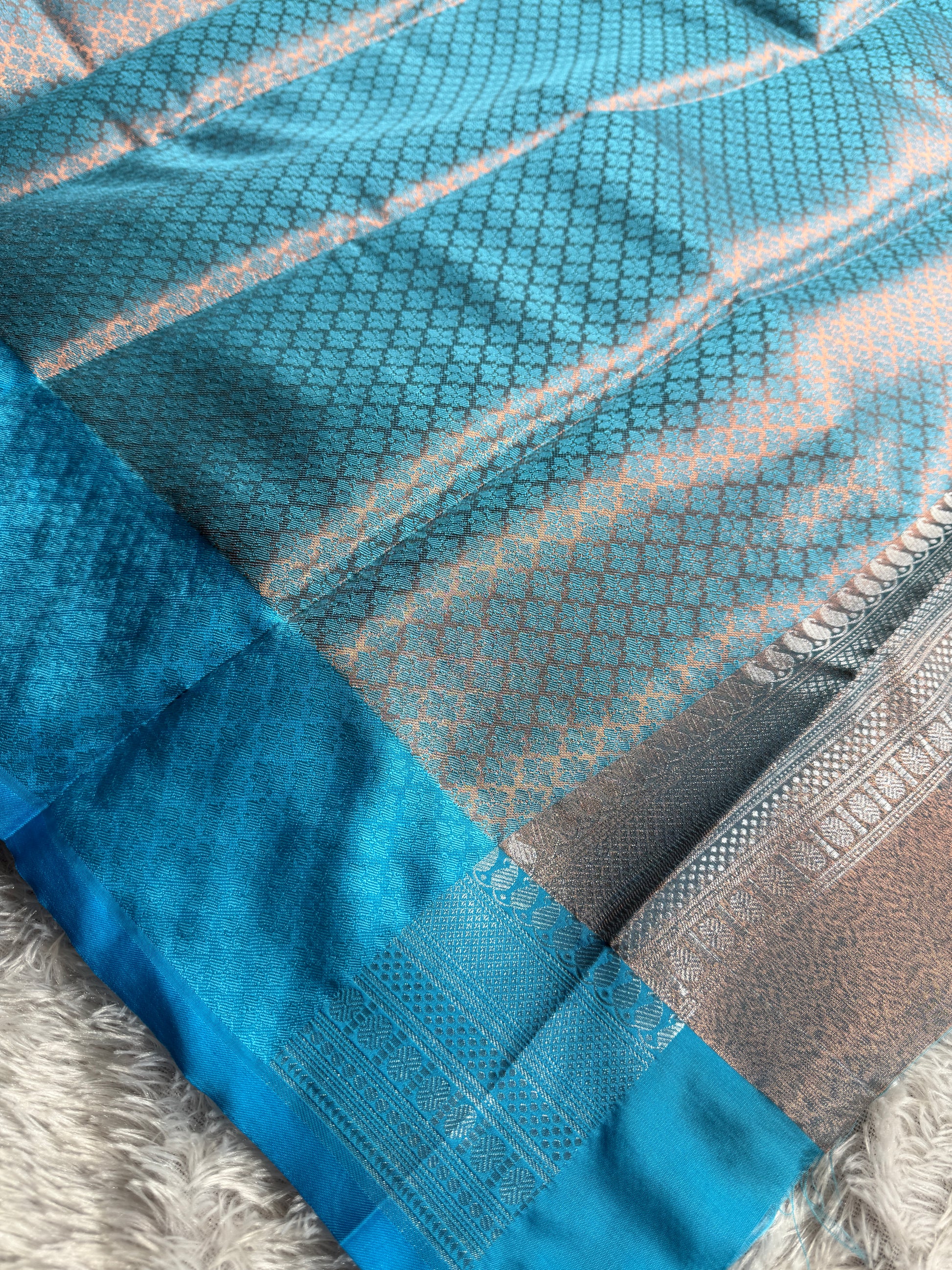 Expertly crafted from premium Banarasi brocade tissue silk, this saree exudes elegance and luxury. Each intricate detail is a testament to the expert weaving techniques used in Banaras. The result is a flawless and lightweight saree that drapes beautifully and adds a touch of sophistication to any occasion.